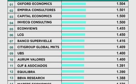 Las cotizaciones más elevadas proyectadas para fin de diciembre para el tipo de cambio oficial mayorista son lideradas por Oxford Economics, con una estimación de $1.504, seguido por Empiria Consultores ($1.501), Capital Economics ($1.500), Invecq Consulting ($1.500) y Econviews, con un previsión de $1.455 para diciembre.